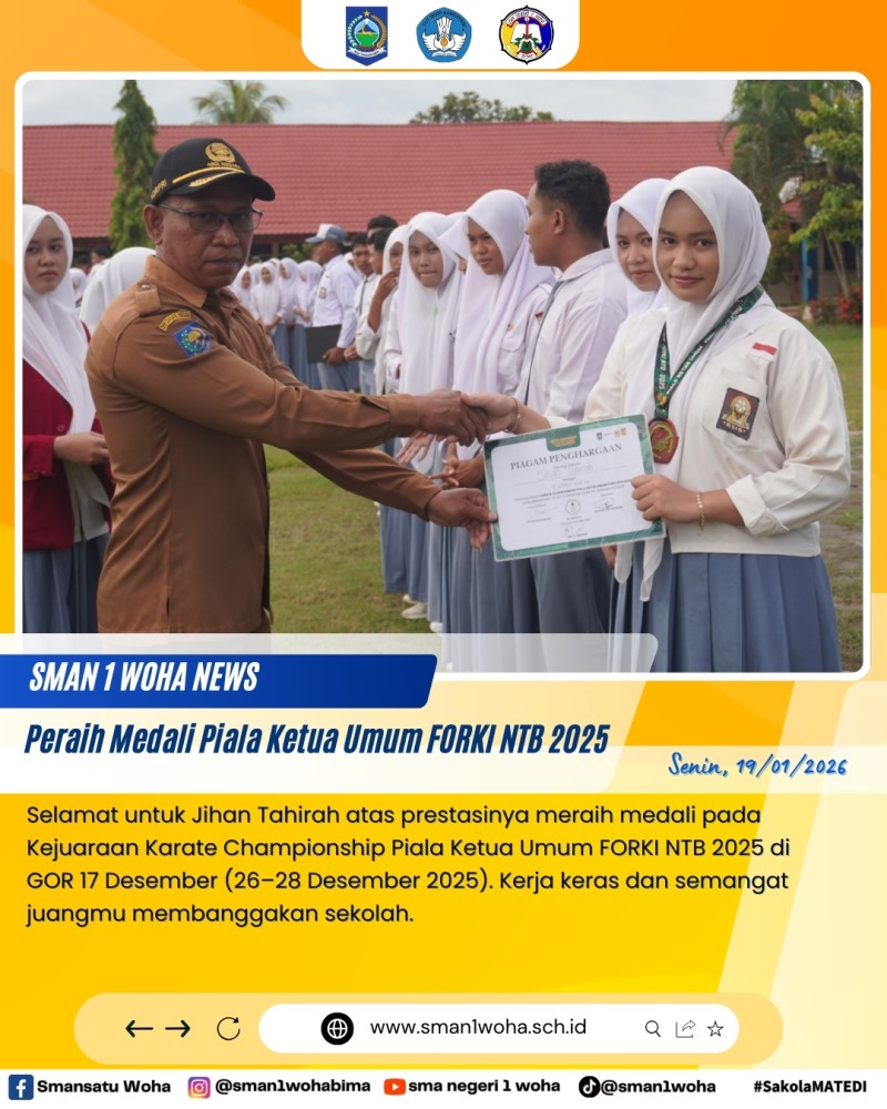 Selamat dan sukses untuk Jihan Tahirah, yang telah menunjukkan prestasi gemilang sebagai peraih medali Piala Ketua Umum FORKI NTB Tahun 2025 pada ajang yang diselenggarakan di GOR 17 Desember pada tanggal 26–28 Desember 2025. Dengan kerja keras, disiplin, dan semangat pantang menyerah, Jihan berhasil mengukir prestasi yang membanggakan bagi diri sendiri, keluarga, dan provinsi NTB.