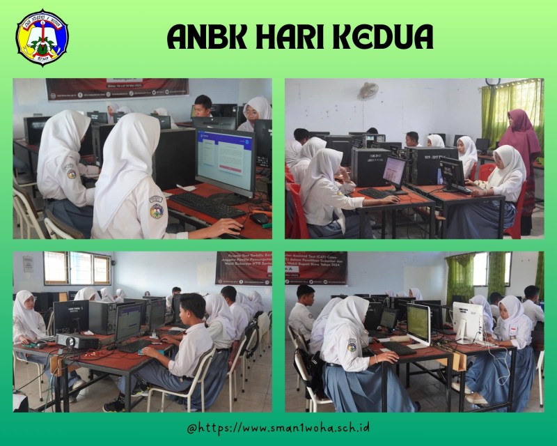 Woha, 20 Agustus 2024. Pelaksanaan Asesmen Nasional Berbasis Komputer (ANBK) di SMAN 1 Woha memasuki hari kedua pada Selasa, 20 Agustus 2024. Pada hari ini, fokus asesmen adalah Numerasi dan Survey Lingkungan Belajar. Sebanyak 45 peserta ANBK hadir tepat waktu dan mengikuti asesmen dengan tertib di dua laboratorium komputer yang telah disiapkan oleh sekolah.
