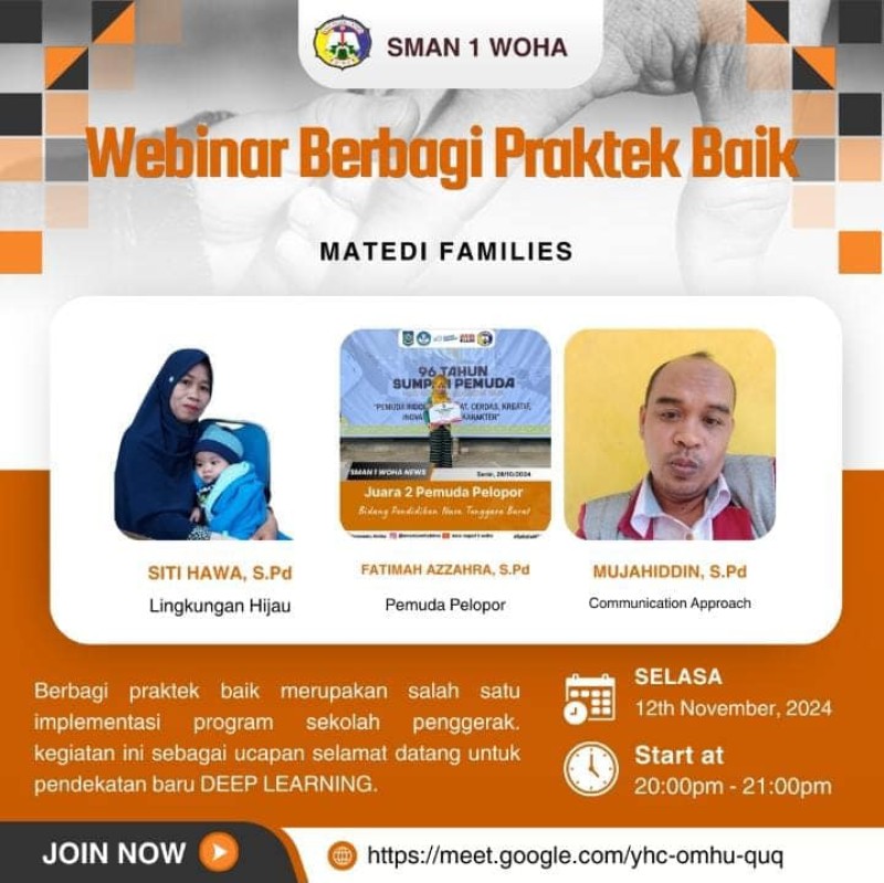Tim kurikulum SMAN 1 Woha mengadakan Webinar MATEDI Families yang menghadirkan guru-guru hebat sebagai narasumber. Kegiatan dibuka dengan sambutan dari ketua panitia Bapak Hartomo, M.Pd dan Ilyas, S.Pd dan dilanjutkan oleh Kepala Sekolah Hairul Juhdy, S.Pd. Dalam webinar ini, narasumber berbagi praktik baik dalam pengajaran, memberikan wawasan dan inspirasi kepada peserta. Acara ini bertujuan untuk meningkatkan kompetensi pengajaran dan memperkuat kolaborasi di antara para pendidik.