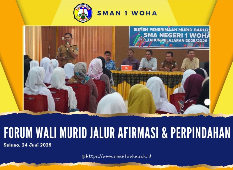 Woha, 24 Juni 2025 - SMAN 1 Woha menggelar Forum Wali Murid Jalur Afirmasi dan Perpindahan dalam rangkaian Seleksi Penerimaan Murid Baru (SPMB) Tahun Pelajaran 2025/2026. Kegiatan ini menjadi langkah awal sekolah dalam membangun komunikasi dan kolaborasi erat dengan masyarakat, khususnya para wali murid siswa baru. Forum ini menjadi ruang komunikasi yang terbuka bagi sekolah dan wali murid untuk berdiskusi mengenai akademik, non akademik, serta rencana program sekolah ke depan.