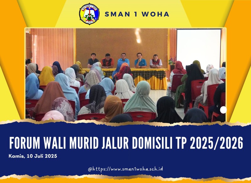 Woha, 10 Juli 2025 - SMAN 1 Woha menggelar Forum Wali Murid Jalur Domisili dalam rangkaian Seleksi Penerimaan Murid Baru (SPMB) Tahun Pelajaran 2025/2026. Kegiatan ini menjadi langkah awal sekolah dalam membangun komunikasi dan kolaborasi erat dengan masyarakat, khususnya para orang tua siswa baru.